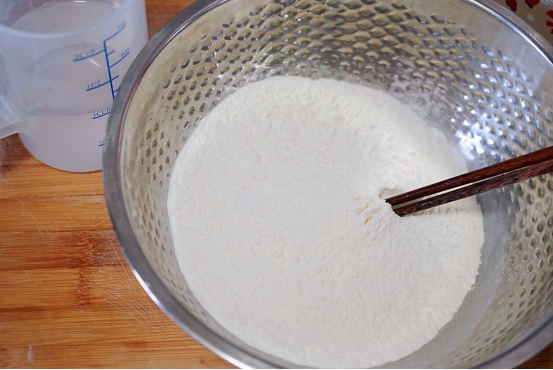 2、和面的时候将面放入和面的盆中,然后往白面里面加热水,一边倒水一边用筷子搅动,水和面混合好之后,再加适量的食用油在面中。
