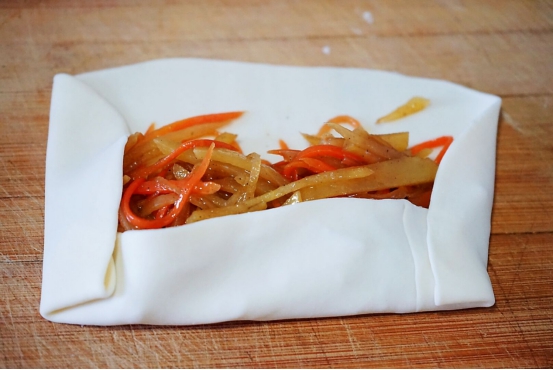 11、然后将四边向里面折,将馅料包在面皮里面,这样土豆丝卷饼就可以下锅煎熟了。