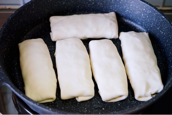12、选择平底锅来煎土豆丝卷饼,锅里刷油后将土豆丝卷饼放入锅中,先将封口的那一边煎熟。