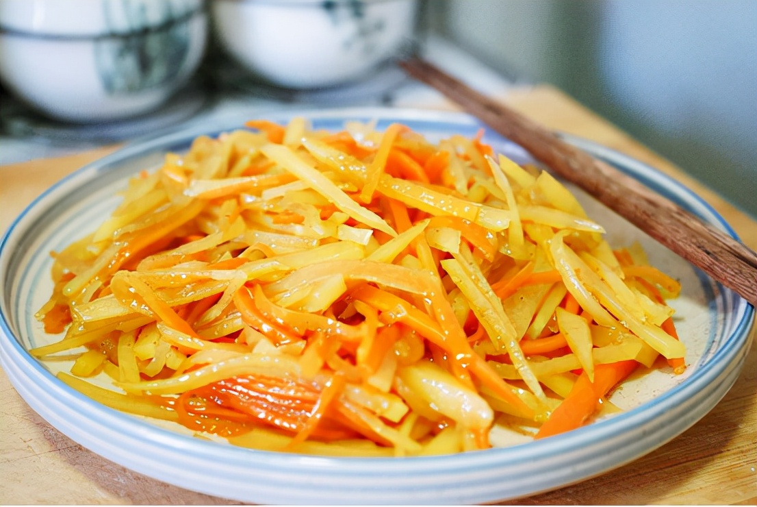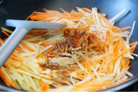 7、不需要炒太长时间,将材料都下锅之后,翻炒几分钟后让土豆丝和胡萝卜丝颜色变深炒熟后就可以从锅中盛出来。