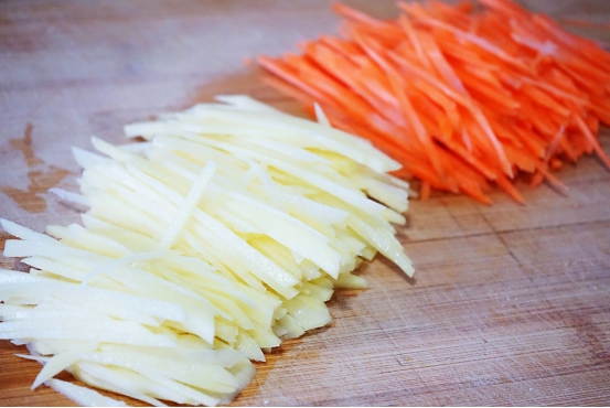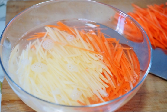 5、这里土豆丝和胡萝卜丝的比例没有特殊要求,土豆丝一般会比胡萝卜丝多一些,这个按照个人口味来放,切丝之后将土豆丝和胡萝卜丝都放入加了水的碗中。