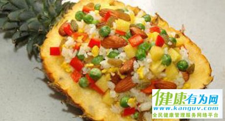 1.菠萝一个,沿三分之一处切开,将菠萝肉取出,用刀切几条用勺取出菠萝肉,并用刀切成块