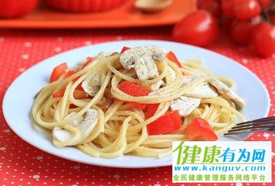 食材:橄榄油l、松子、红椒、蘑菇、蒜、盐、黑胡椒、直面。