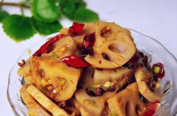 3、起油锅,小火慢炸干红辣椒段和花椒粒,直至香味飘出,趁热浇在拌好的藕片上即可